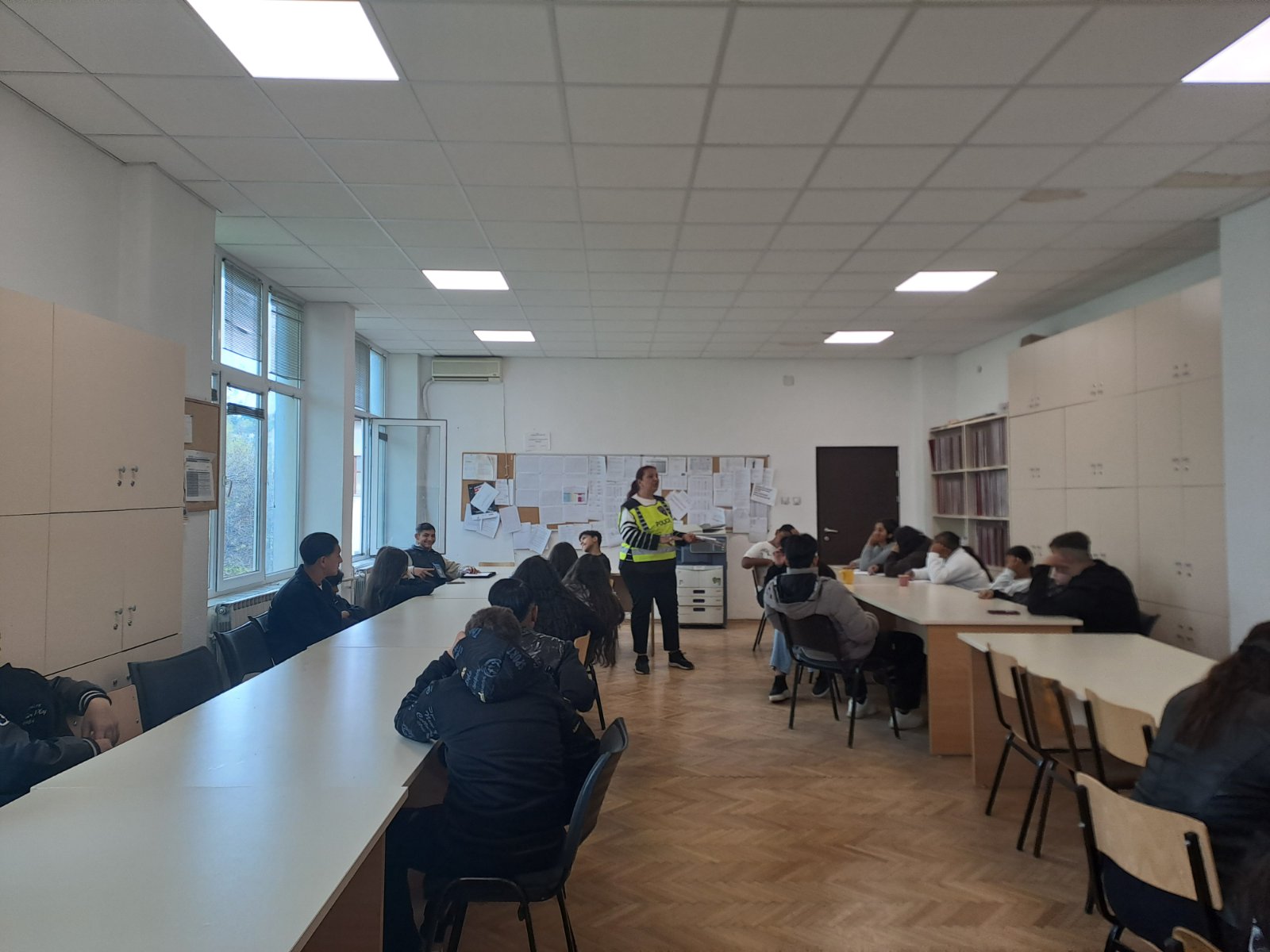 During yesterday, police officers from the Prevention Department of the Tetovo Police Department held an educational lecture for third-year students at the Municipal Gymnasium in the village of Negotino, Vrapčište Municipality, on the topic "Cheering Should Be Support, Not Insult; Sports Unite," aimed at preventing violence at sporting events and hate speech.