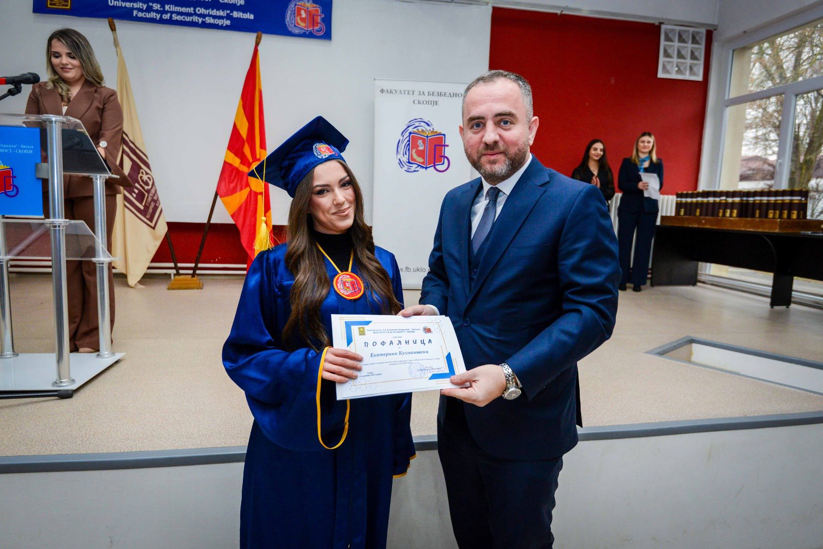 Во рамки на посетата, министерот Тошковски се обрати и на Свечената церемонија по повод промоцијата на дипломираните и магистрираните студенти на Факултетот за безбедност, упатувајќи честитки до студентите и професорите. Тој најави дека Министерството за внатрешни работи ќе потпише договор со кој најдобрите студенти од Факултетот за безбедност во иднина автоматски ќе бидат вработени во МВР.