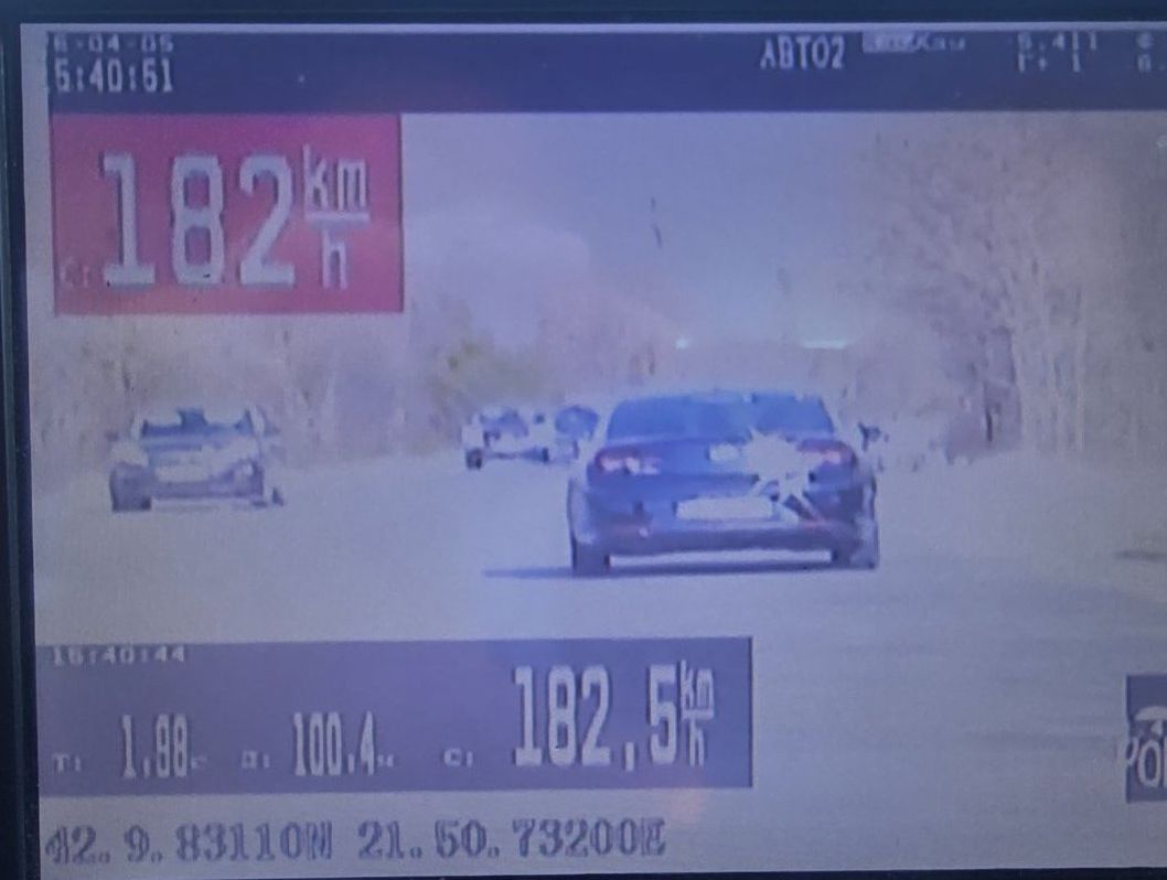 На регионален пат Куманово-Крива Паланка измерена е брзина на возило „опел“ со кумановски регистарски ознаки управувано од Д.Д(37) од Куманово, од 182 километри на час каде максималната дозволена брзина е 80 километри на час.