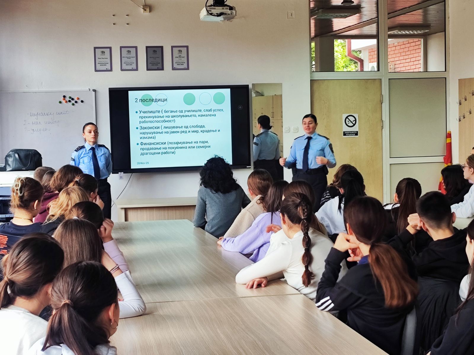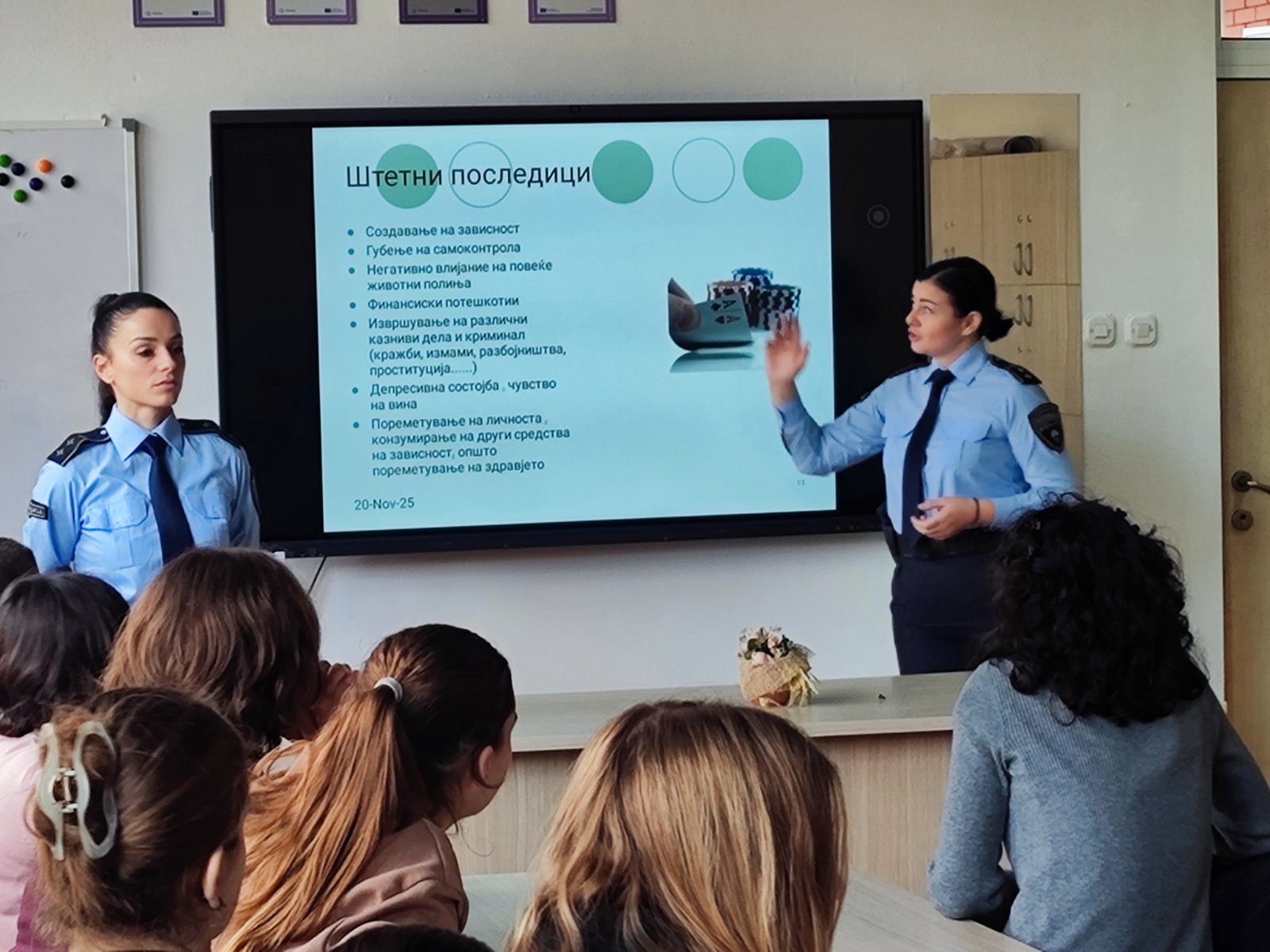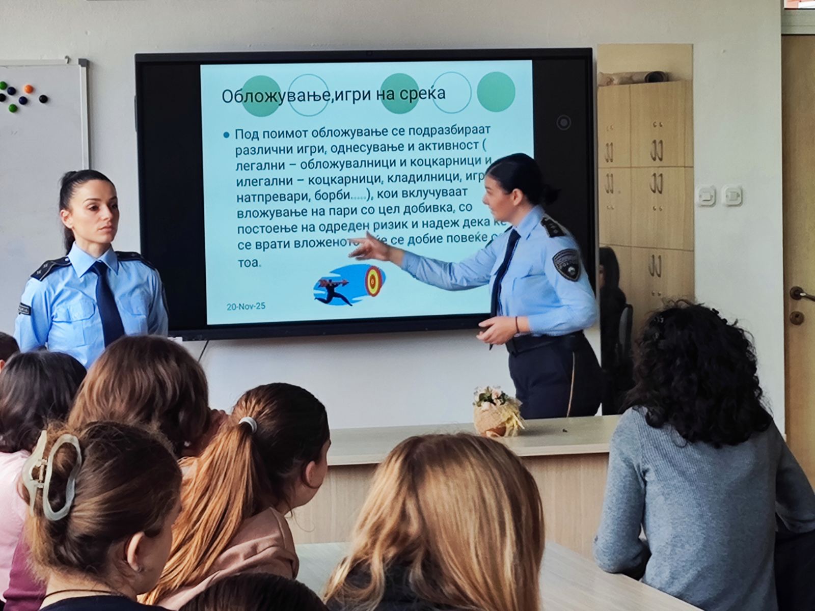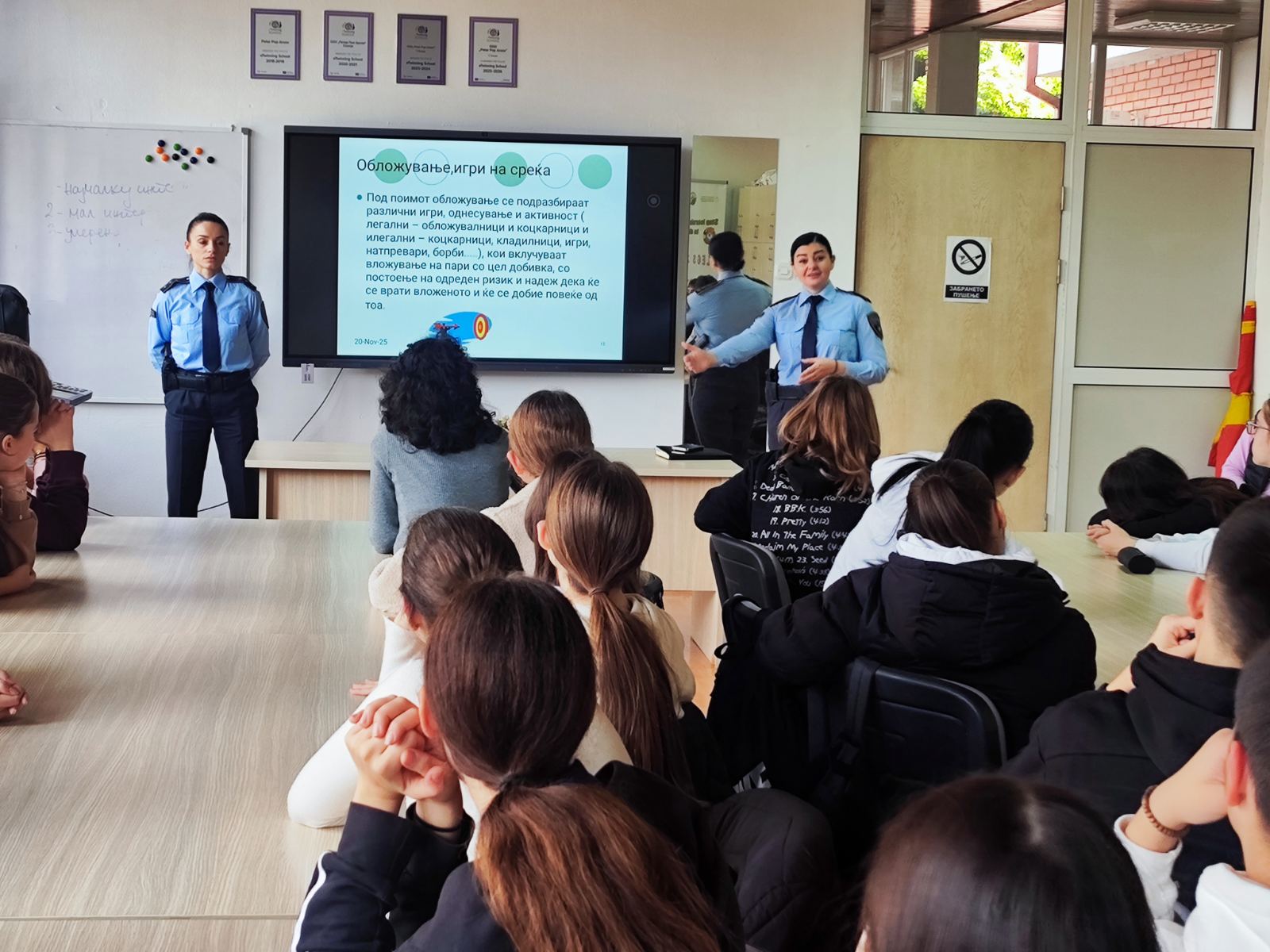 Во рамките на континуираните превентивни активности на Одделението за превенција при СВР Скопје, денеска беа реализирани три едукативни работилници во ООУ „Петар Поп Арсов “ на подрачје на ПС ОН Карпош на тема „Зависности – превенција од игри на среќа и штетните последици“ со ученици од деветто одделение.