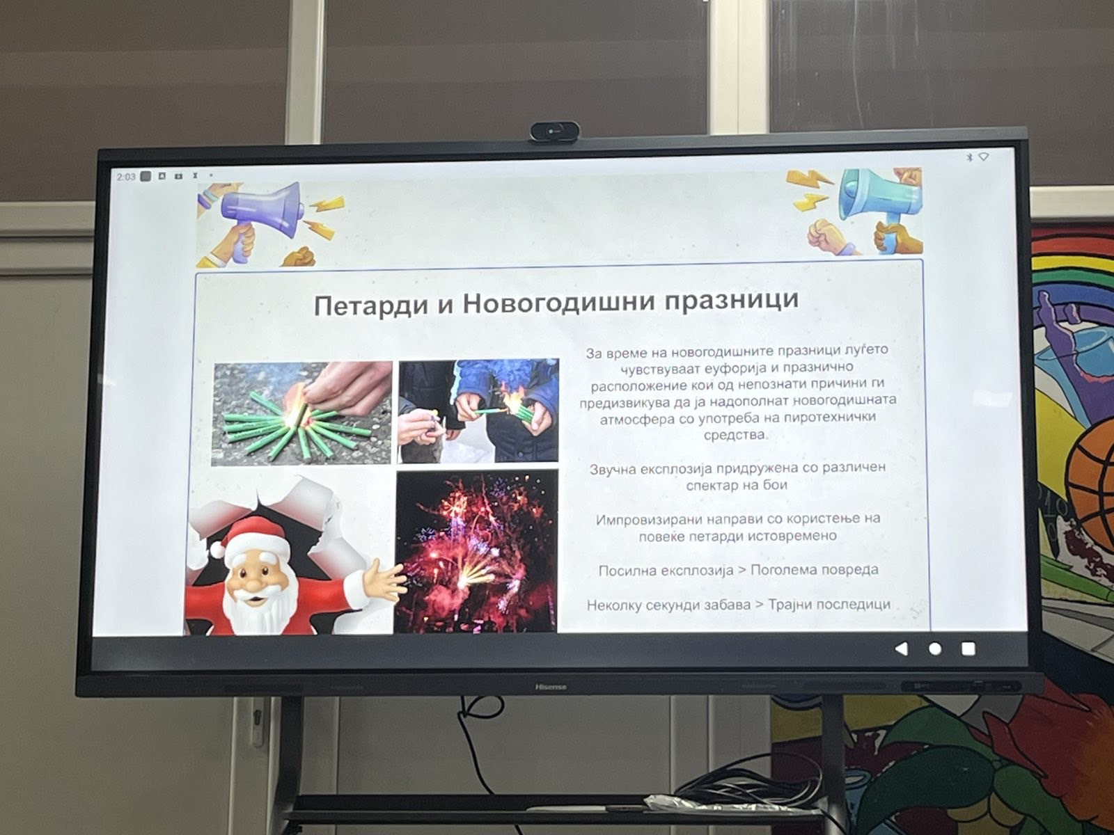 На 24.12.2025 на подрачјето на Полициската станица Центар, Одделението за превенција при СВР Скопје реализираше превентивни активност под мотото „Пиротехника - забавна за момент, кобна за цел живот“. На минувачите им беа поделени едукативни материјали и притоа им беше посочено дека петардите предизвикуваат стрес и интензивно чувство на вознемиреност, како кај луѓето, така и кај животните, и факт е дека огромен број на луѓе во светот секоја година остануваат инвалиди поради употреба на петарди, а од нив поголем дел се деца.